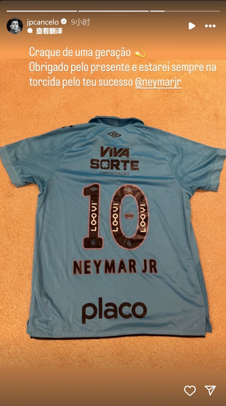 坎塞洛获赠内马尔球衣,他在社交媒体上晒出球衣的照片,配文:“一代巨星,感谢你的礼物,我会一直为你加油!”